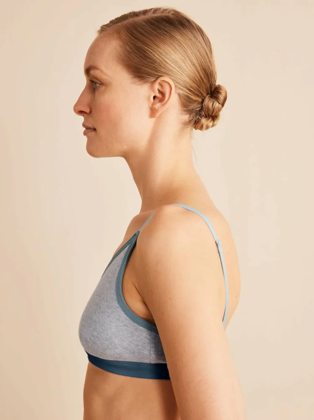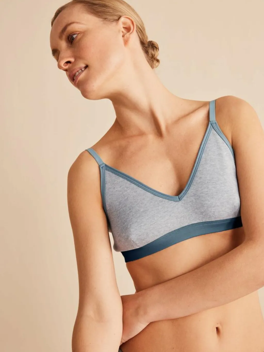 Das Modell in den harmonisch abgestimmten Blau- und Petroltönen ist kaum spürbar und besonders sanft zur Haut. Es schmiegt sich an und drückt nicht. Die Bralette in stabiler Baumwoll-Qualität überzeugt zur Gänze ohne Elasthan. Die verstellbaren Träger sorgen für einen guten Halt, der metallfreie Verschluss für ein angenehmes Tragegefühl. Für das gewisse Etwas sorgt der in Kontrast gesetzte, weiche Gummibund.
