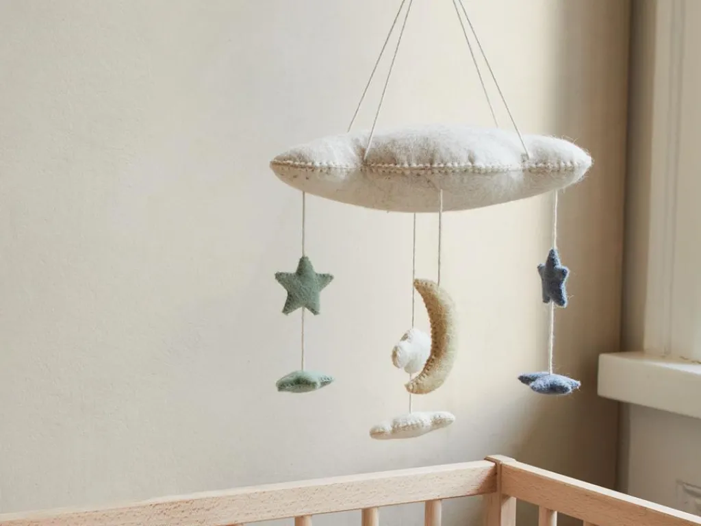 In sorgfältiger Handarbeit aus natürlicher Schafschurwolle gefilzt. Die ökologisch gefärbten Filzkugeln bringen sanfte Farbtöne ins Kinderzimmer. Über dem Bett oder der Wiege angebracht, soll es Babys beruhigen, bis die kleinen Augen müde werden.
