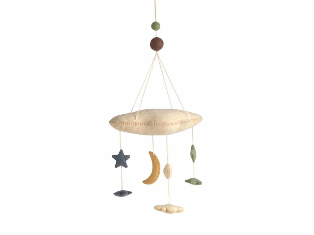 In sorgfältiger Handarbeit aus natürlicher Schafschurwolle gefilzt. Die ökologisch gefärbten Filzkugeln bringen sanfte Farbtöne ins Kinderzimmer. Über dem Bett oder der Wiege angebracht, soll es Babys beruhigen, bis die kleinen Augen müde werden.